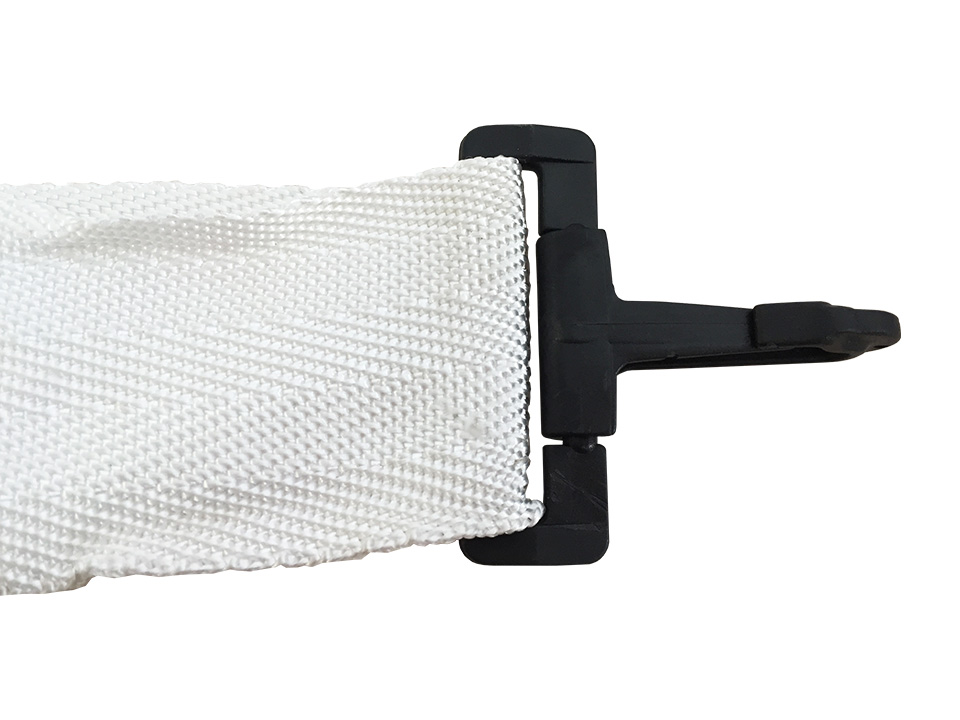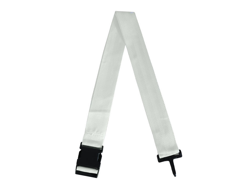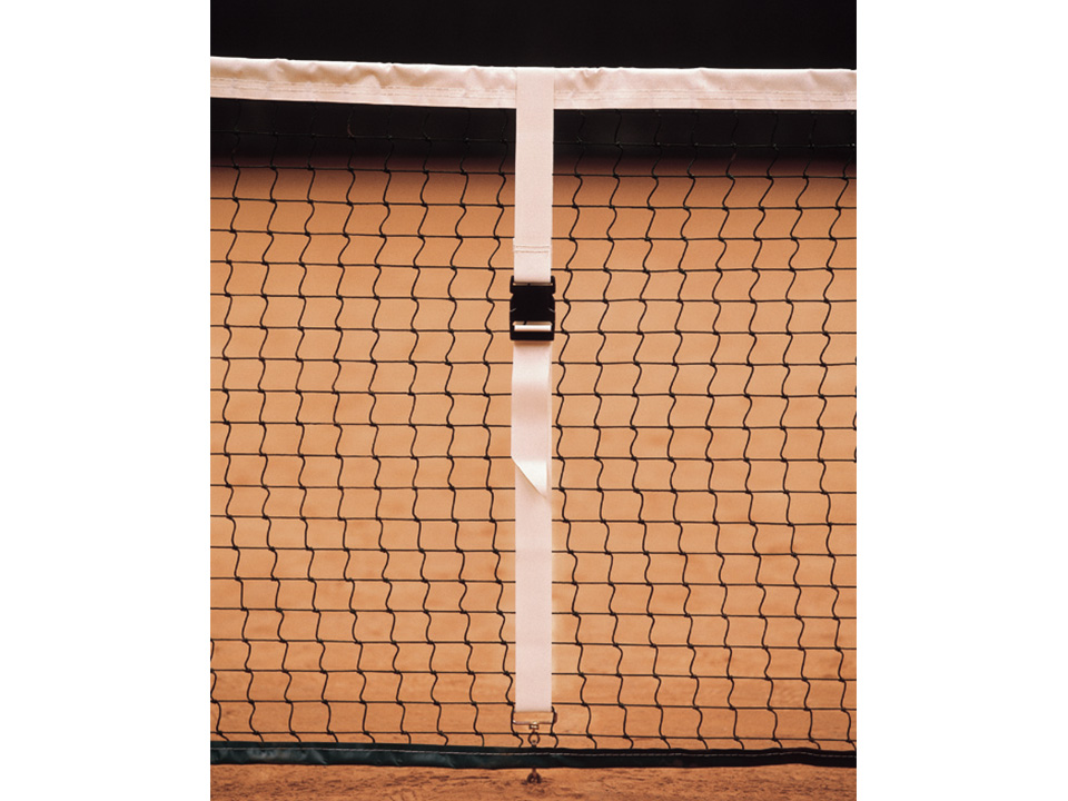 The strap with a side release buckle is made of white polyester with a PVC hook. It allows for adjustment of the height of the net in the center of the court.