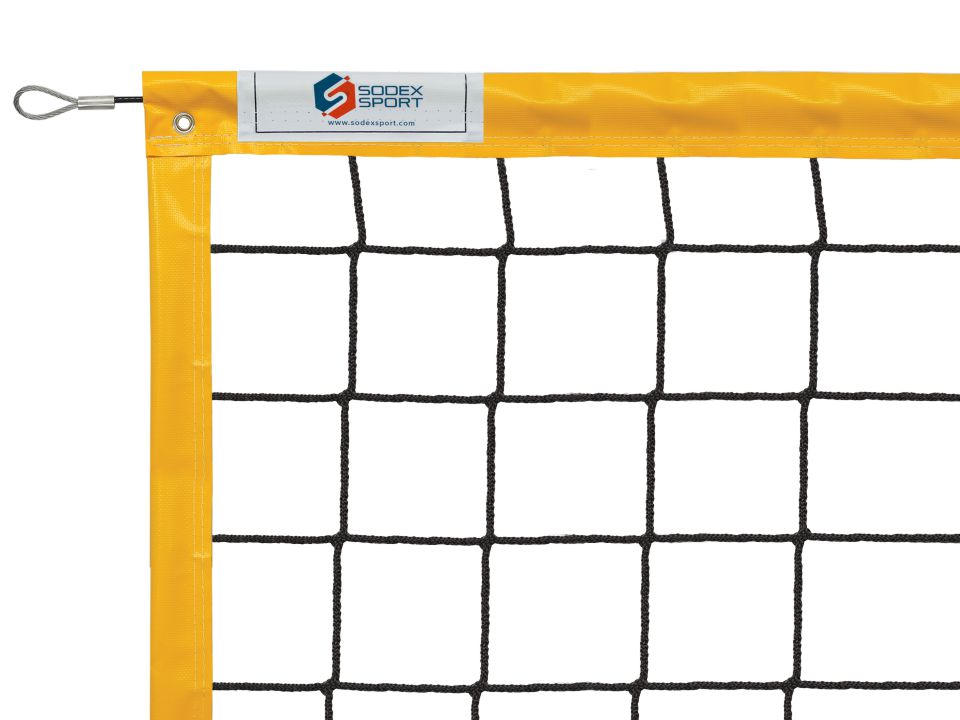 Competition beach volleyball knotless net in black Ø3.0mm high-density HDPP anti-UV treated braided twine, 100mm single mesh. Length 8.5m, height 1.0m with yellow PVC headband and band on the perimeter.