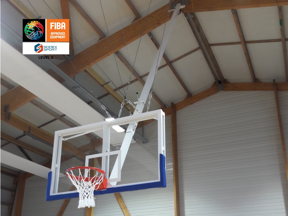 FIBA-certified 5x5 basketball backstop Lvl 2 | Ceiling suspended | Adjustable height