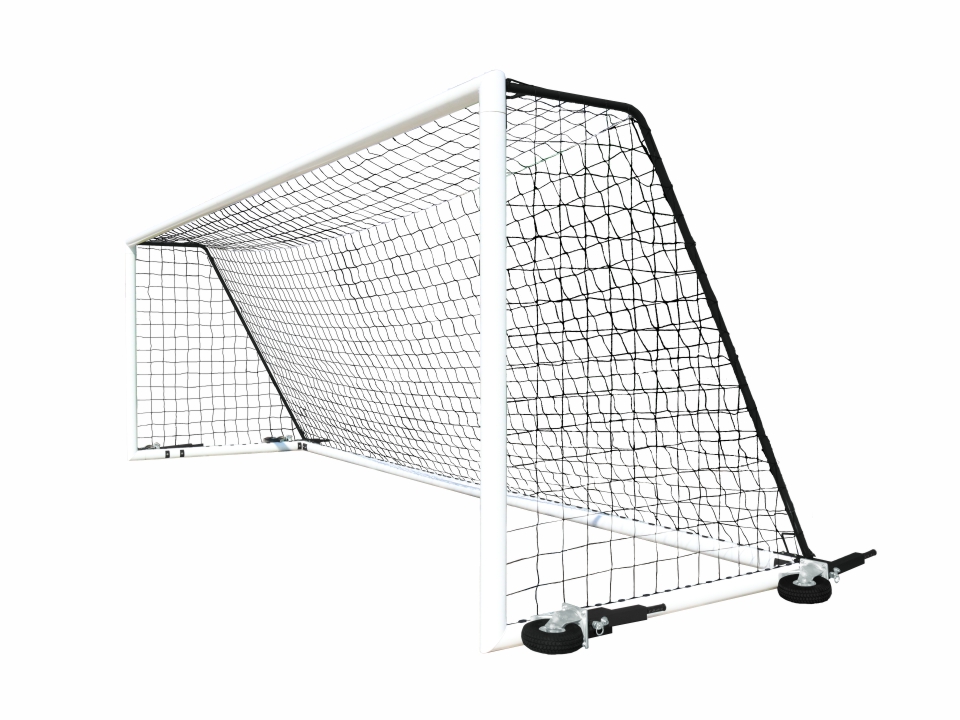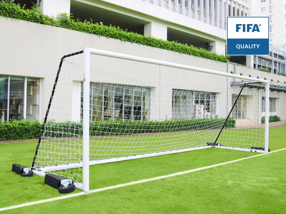 FIFA-certified aluminum senior goal comes in a white powder-coated elliptical aluminum design, complete with an integrated 360° wheel kit for easy mobility.