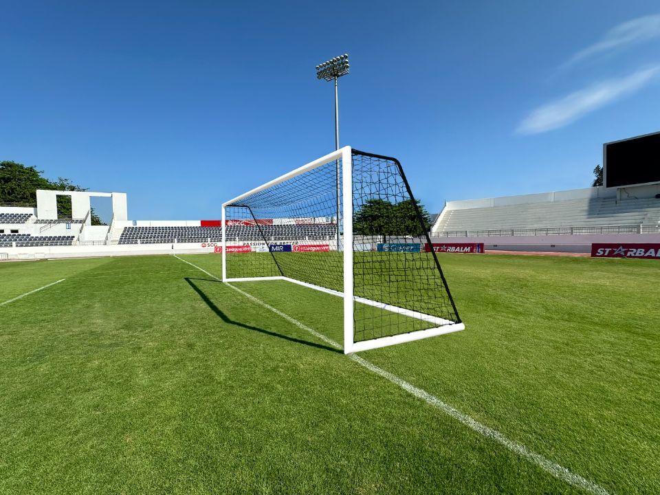 5-a-side football goals in Ø90mm round tube white powder-coated aluminum.