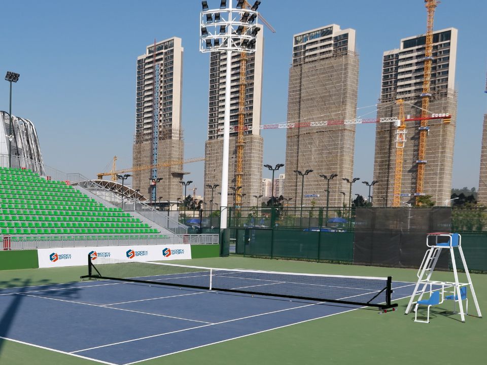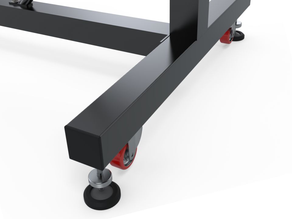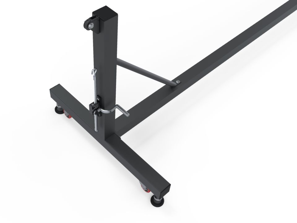 The structure is made out of two uprights with 50 kg counterweights each, and a horizontal section made of 4 x 3.20m steel tubing to facilitate storage and transport.