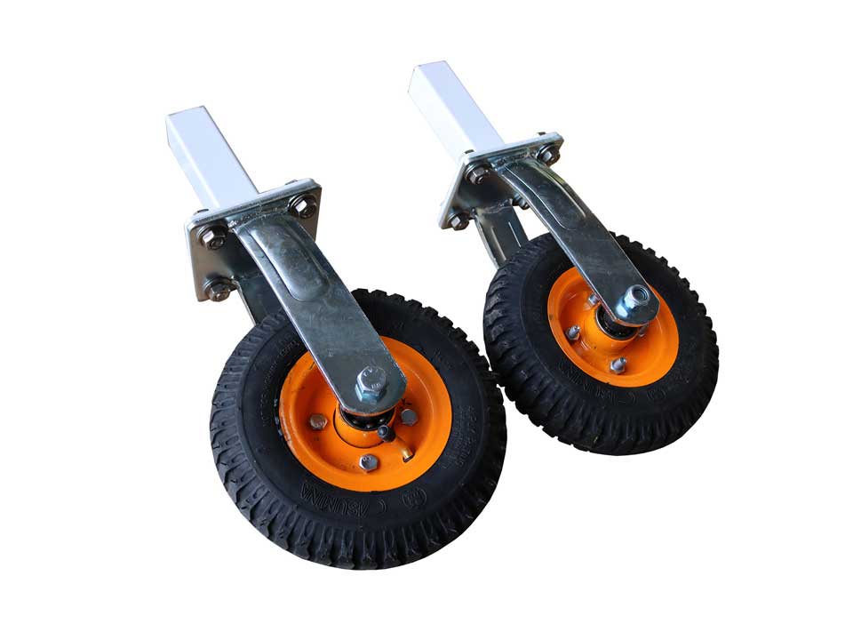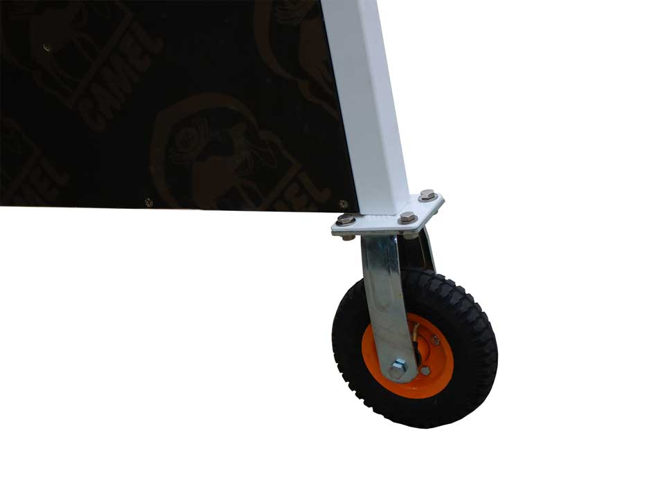 | Offset counterweight with 4 rollers to evenly distribute the weight on the ground | 2 pneumatic wheels slot firmly into the upright to give it top mobility during transport | |