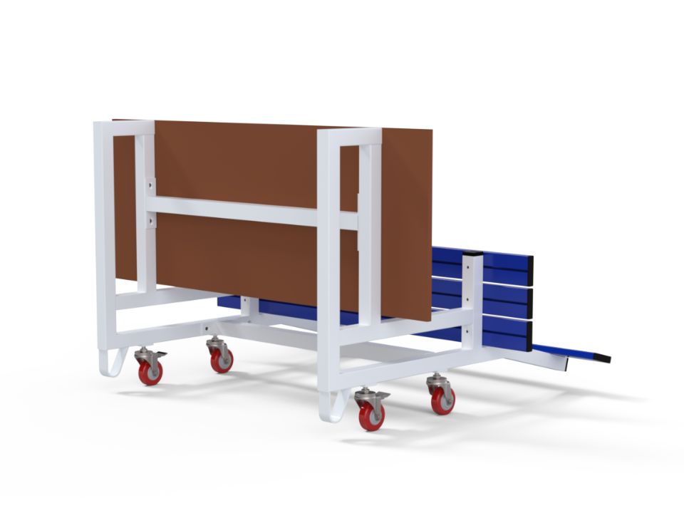 When not in use, these bleachers can be flipped on their side where wheels ease movement.