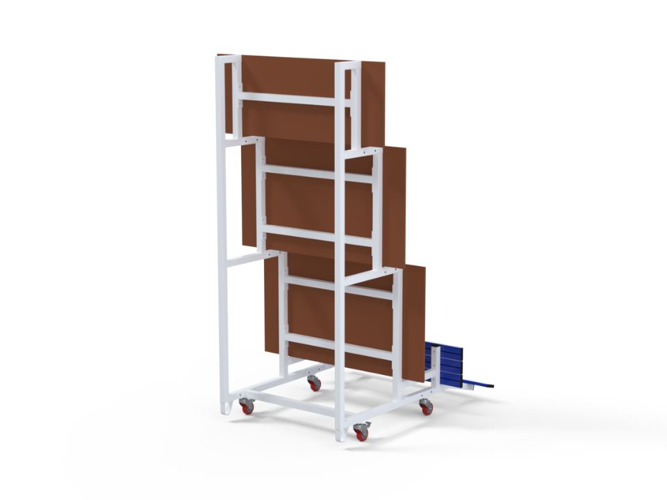 When not in use, these bleachers can be flipped on their side where wheels ease movement.
