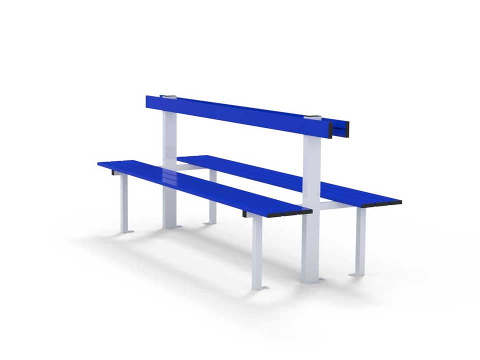 Outdoor player bench with backrest, peg rail and shelf, length 2m. Ground fixations.