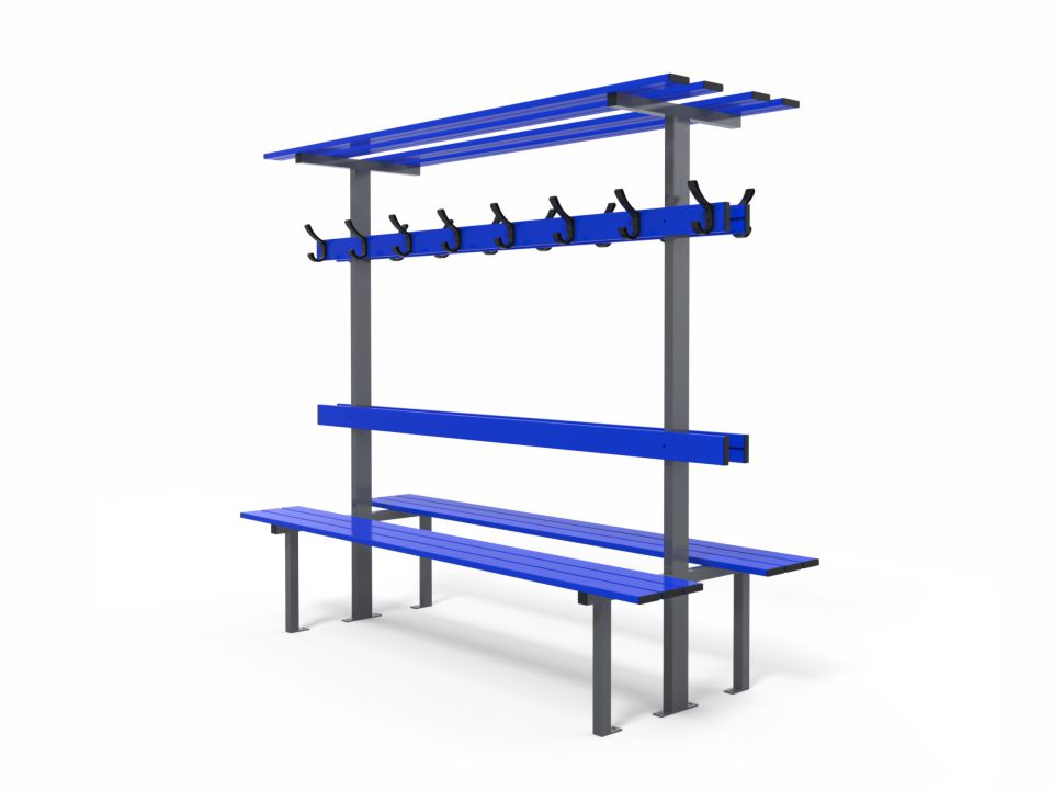 The bench is made of steel frames 35mm x 35mm white powder coated with blue seating, backrest and shelf aluminium bars. The top aluminium peg rail with 8 plastics pegs.