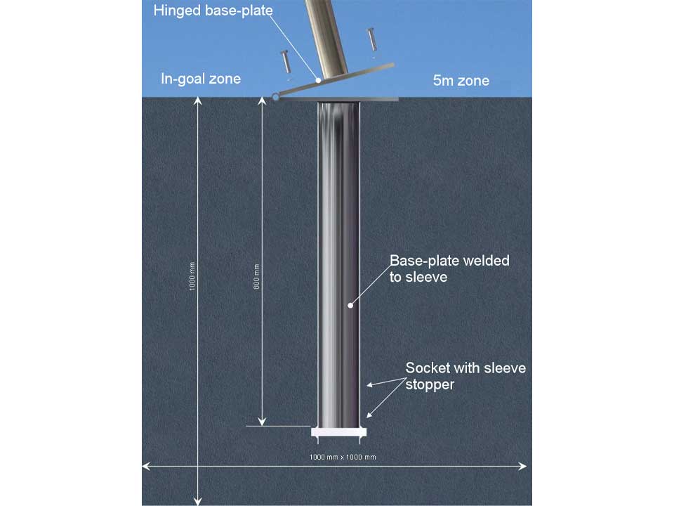 For disassembly, bolts are removed and the goal posts can be safely tilted to the ground and detached from the hinge, which then allows easily lifting out the base- plate and socketed sleeve.
