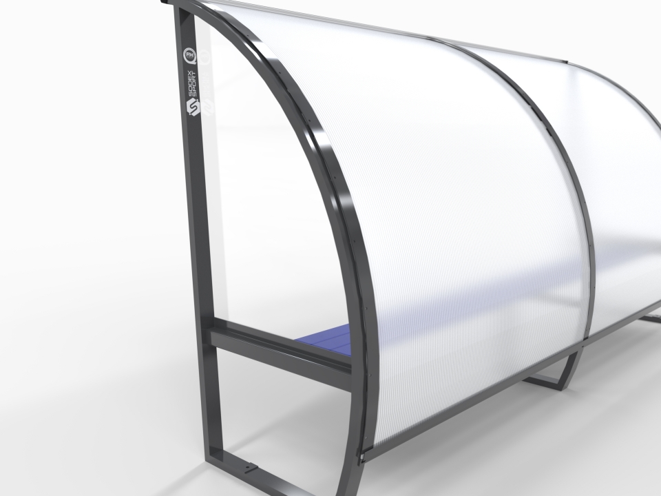 Team shelters are made of powder coated aluminium profile. All sides are impact resistant in order to protect players from balls or projectiles. Top bar with curved profile to prevent head injury and hid fastener.
