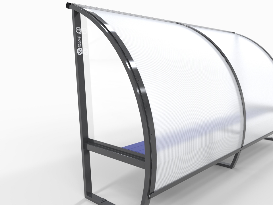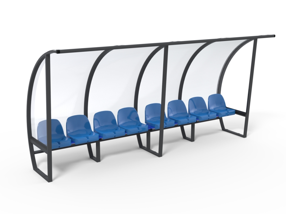 Team shelter 2.0m height to accommodate staff and substitutes during game. Aluminium frame with polycarbonate protection, 4.0m long for 8 players.