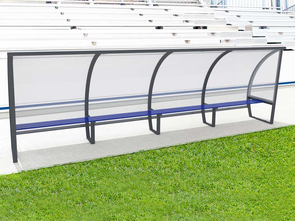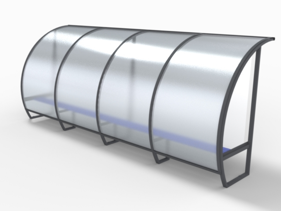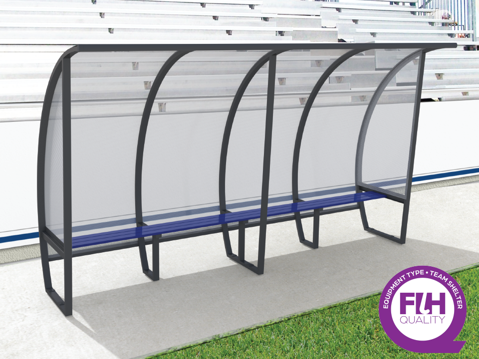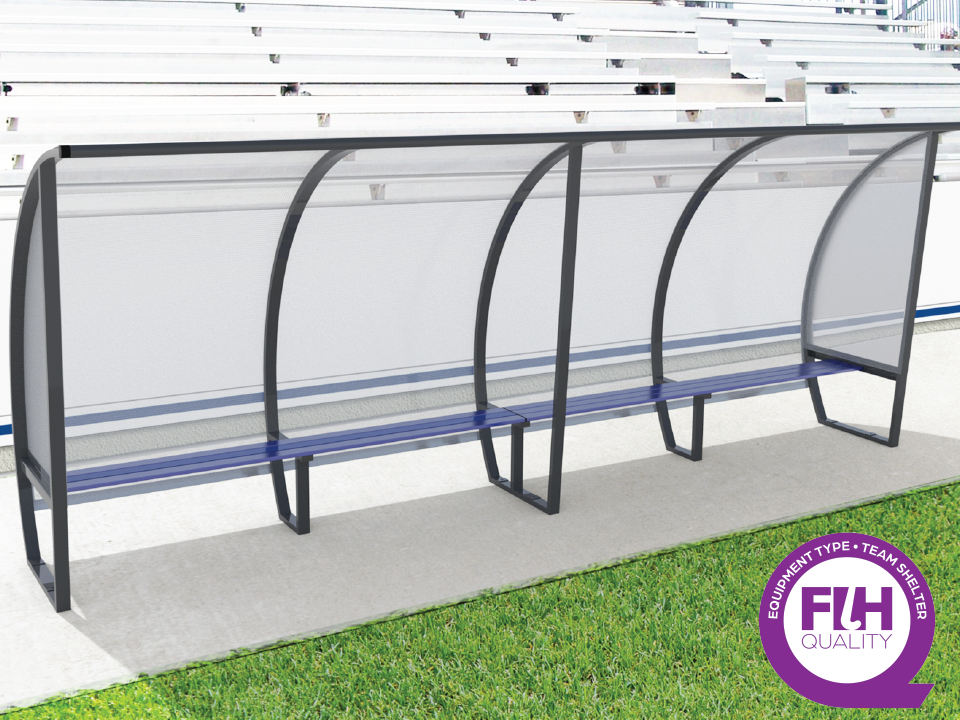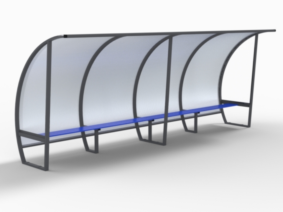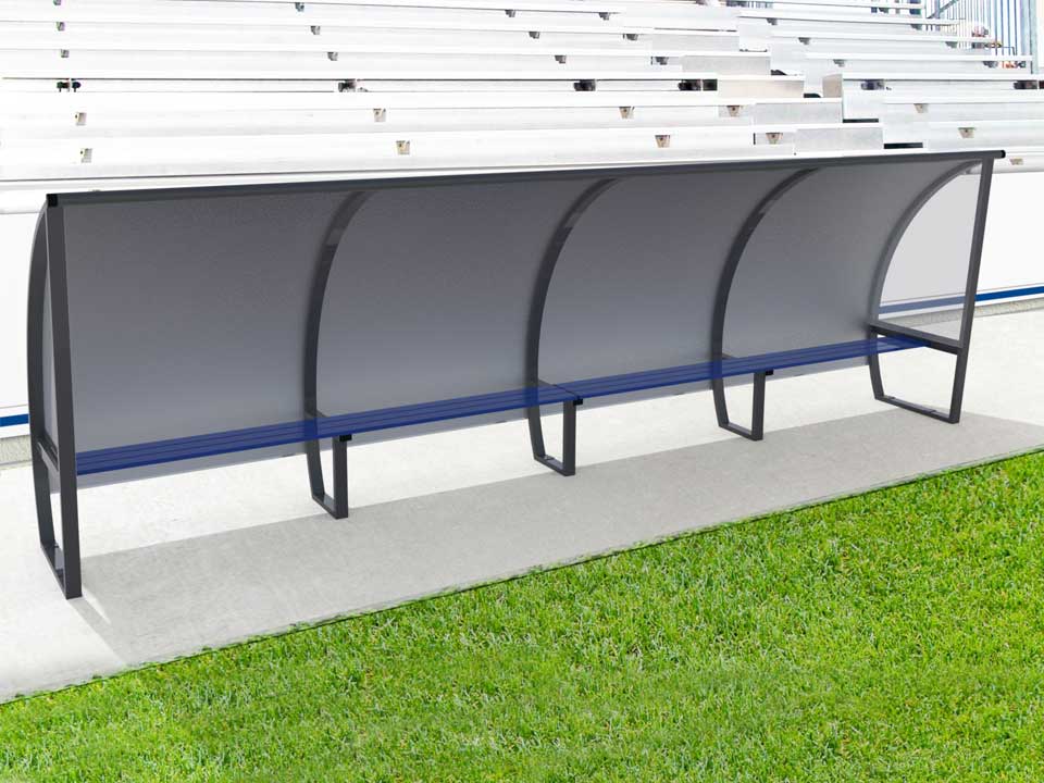 Team shelter 2.0m height to accommodate staff and substitutes during game. Aluminium frame with polycarbonate protection, 5.0m long for 10 players.
