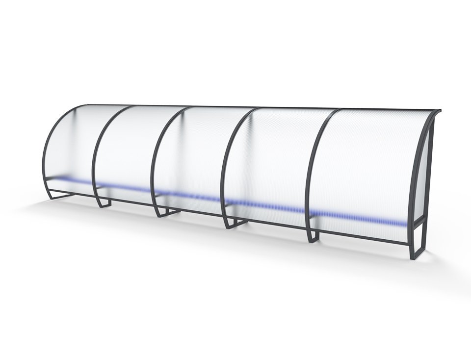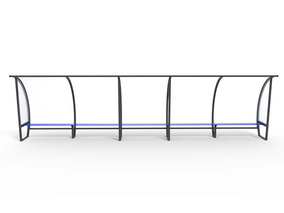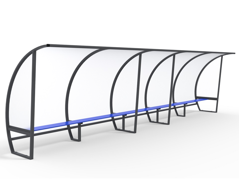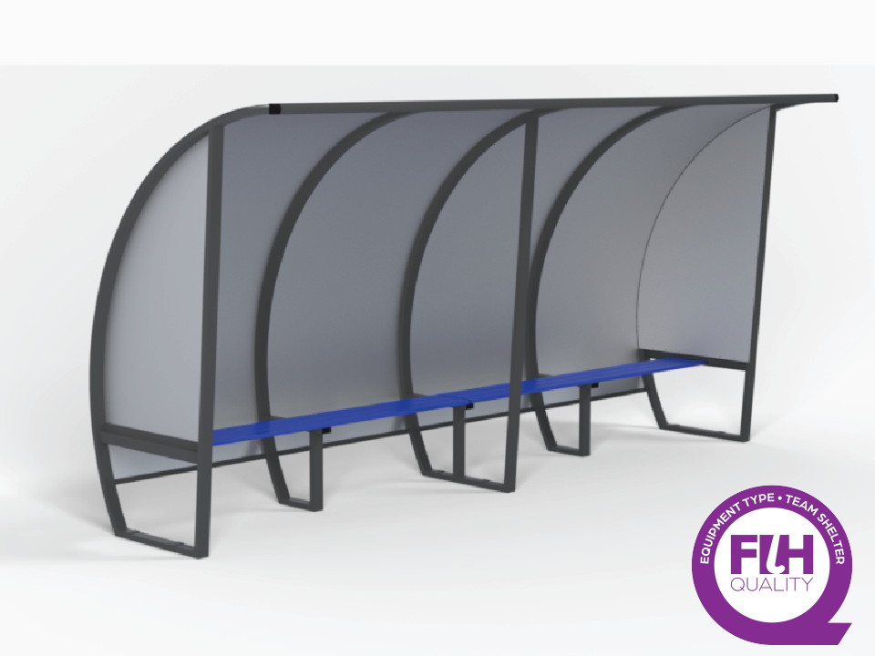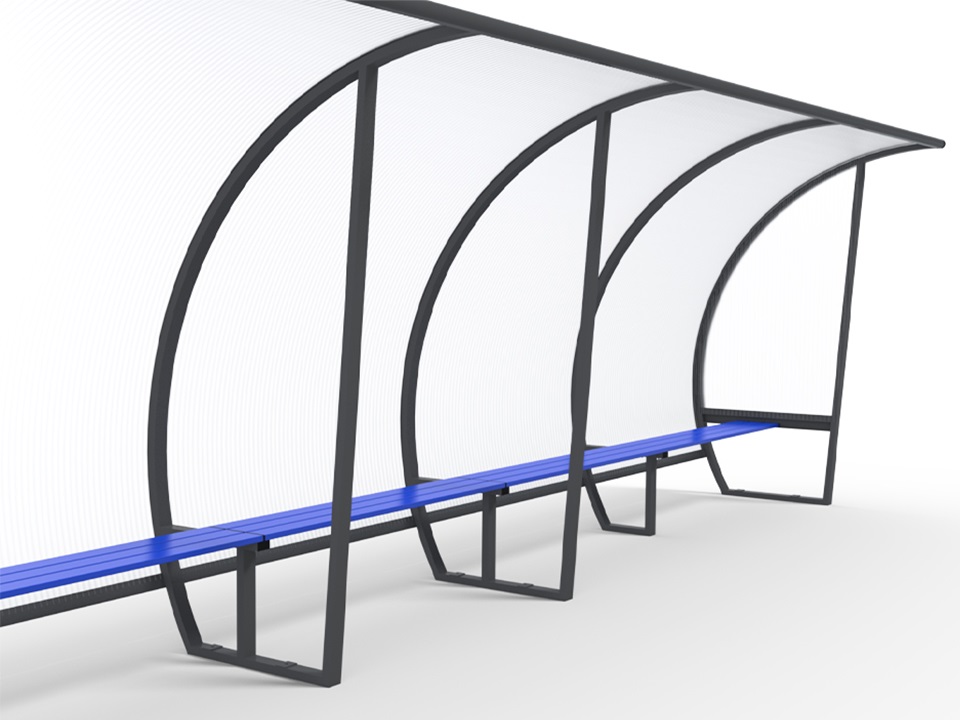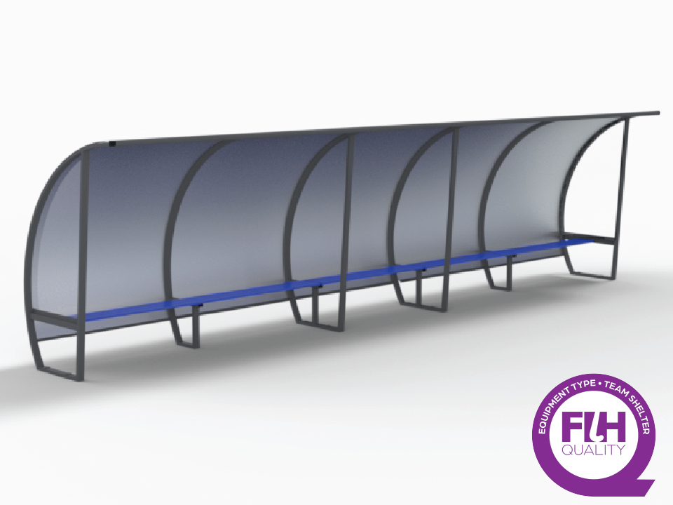 Team shelter 2.0m height to accommodate staff and subsitutes during game. Aluminium frame with polycarbonate protection, 7.5m long for 15 persons.