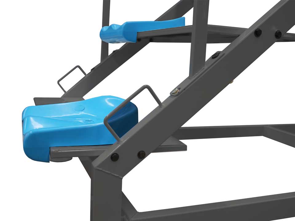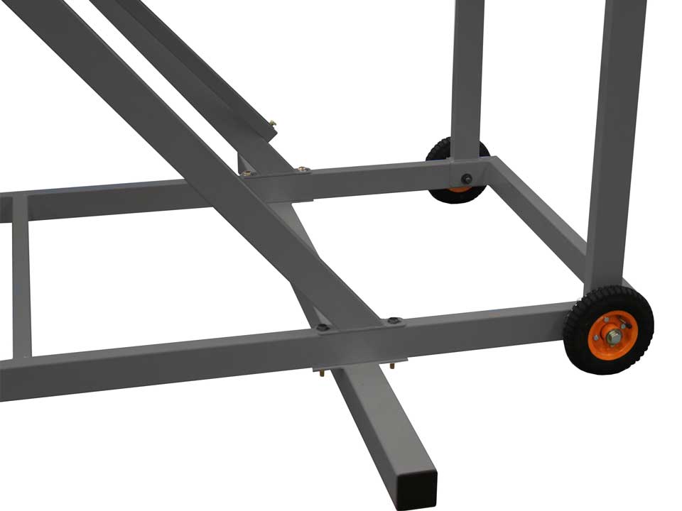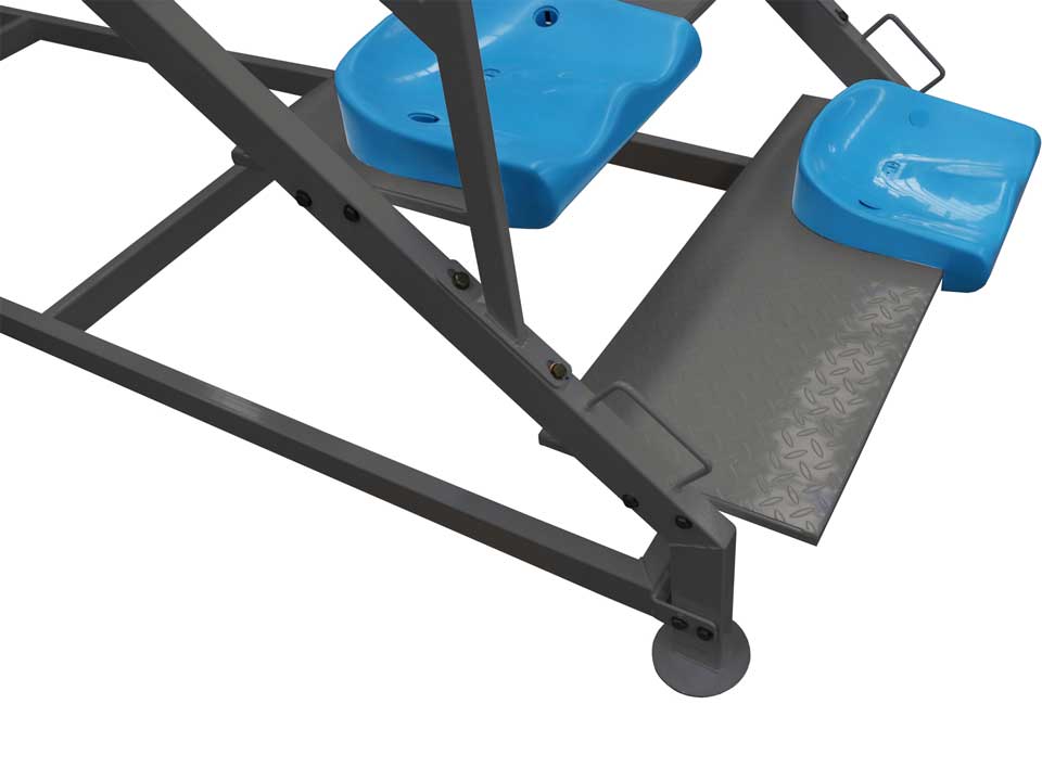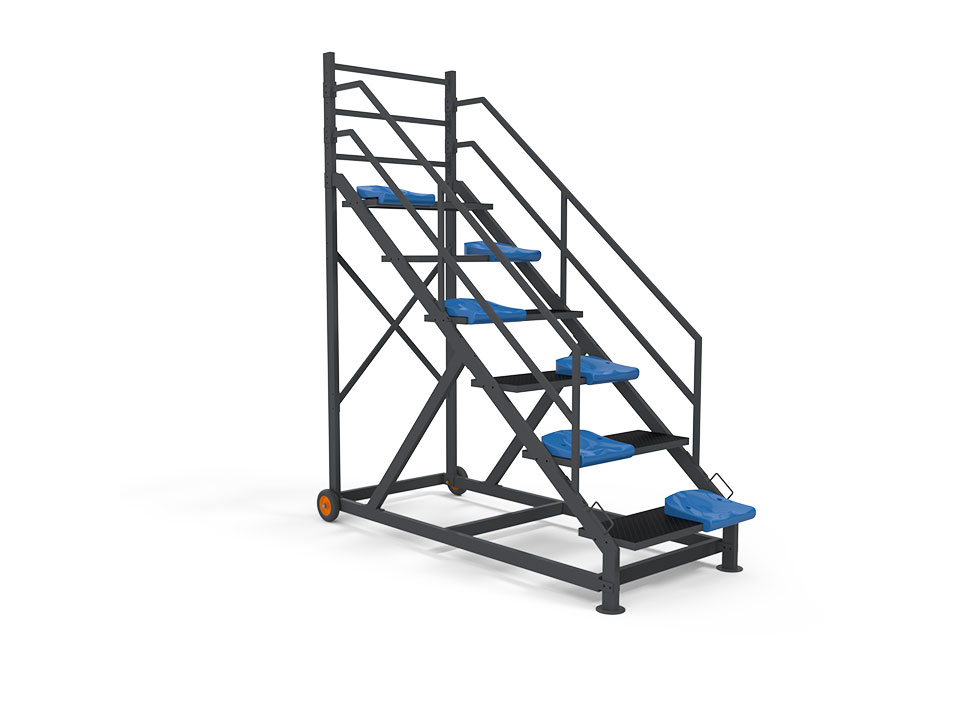 Structure with reinforcement bars and | Wheels in the rear position for easy movement | 40x20mm railings and anti-slip panel flooring to ensure user safety | |