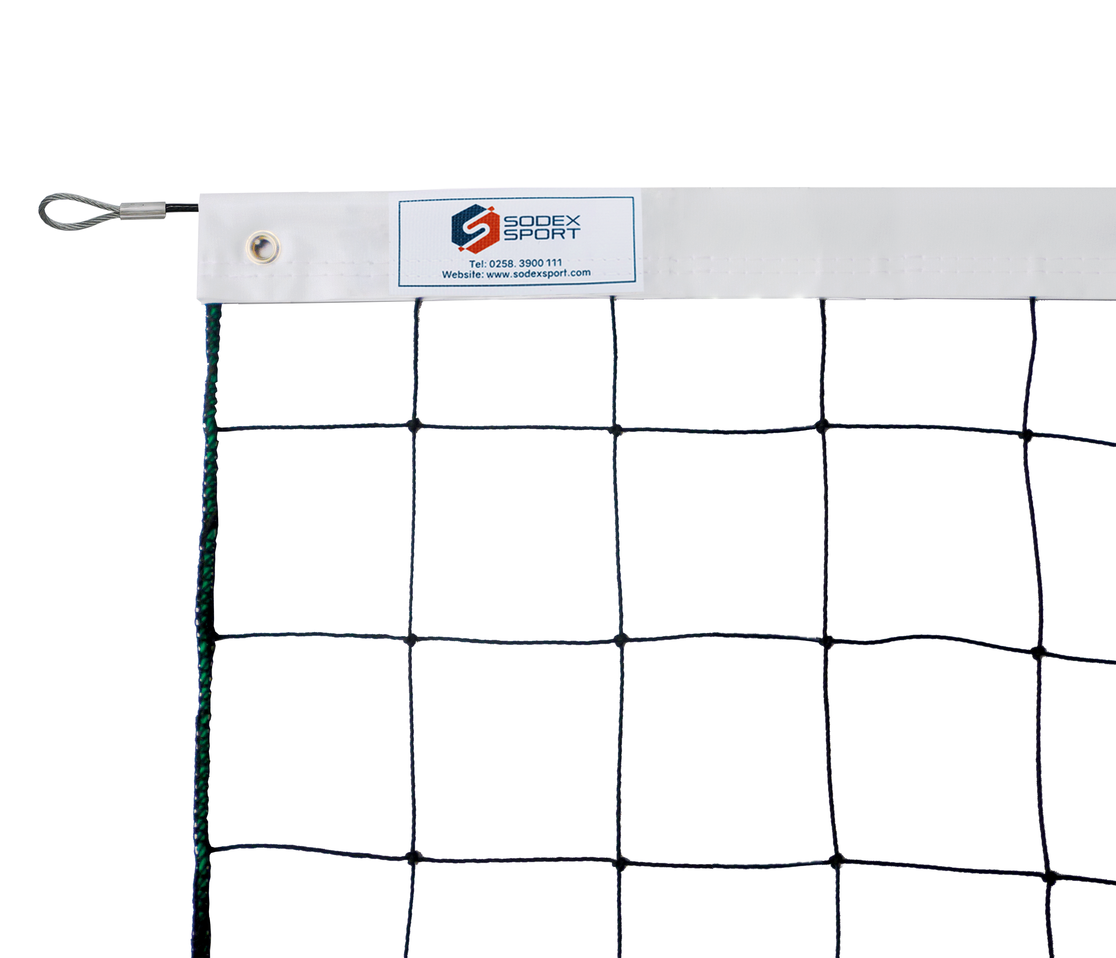 Volleyball knotless nets, braided Ø3.0mm, 100mm single mesh, top band with white PVC, side tapes, tension by 5mm galvanised cable.