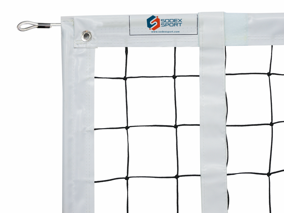 Volleyball knotless nets, braided Ø4.0mm, 100mm single mesh, top band with white PVC, side tapes, tension by 5mm galvanised cable.