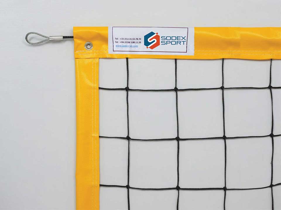 Competition beach volleyball knotless net in black Ø3.0mm high-density HDPP anti-UV treated braided twine, 100mm single mesh. Length 8.5m, height 1.0m with yellow PVC headband and band on the perimeter.