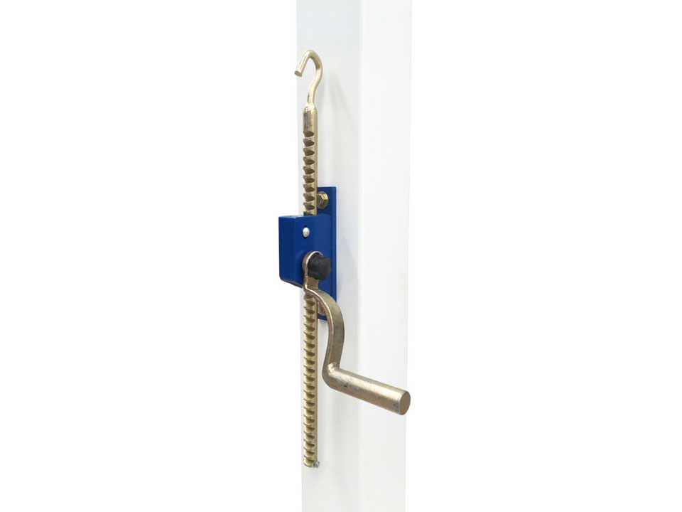 | Aluminum and steel external winch for tennis, volleyball and pickleball posts. The casing is made out of powder-coated aluminum. The winch is fastened to the posts thanks to two bolts (included). The fastenings are 15cm apart. The winch travels a total of 39cm vertically. The crank handle can easily be removed once the net has been tightened. |