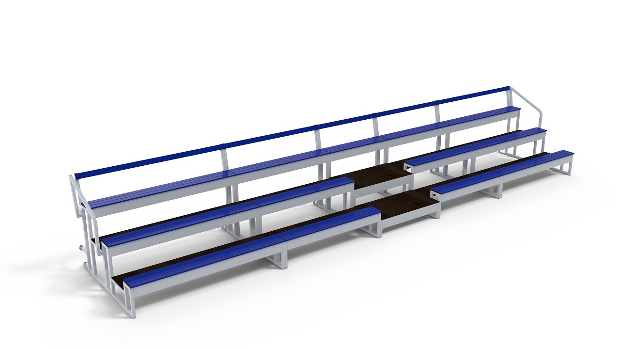 The compact design mobile bleacher has 3 rows of seats for 47 people.