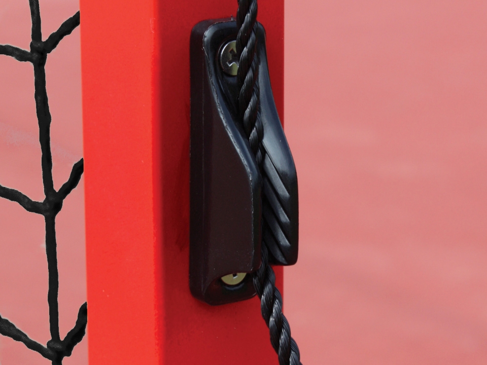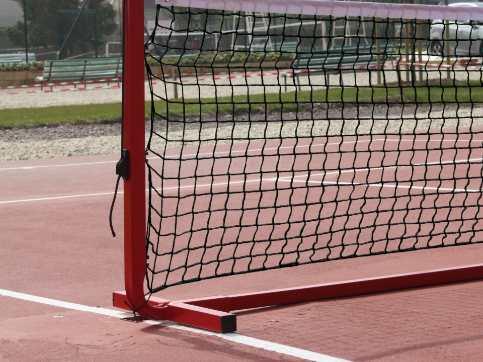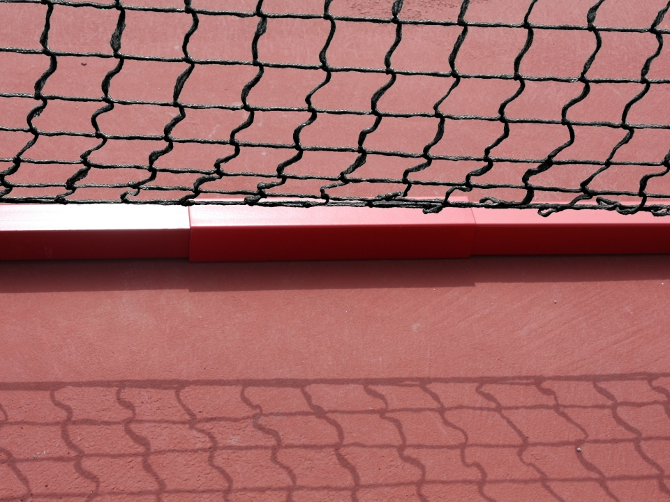 Wheelaway mini tennis posts, red powder coated, aluminum uprights, 4m long with steel ground bars, delivered without net.