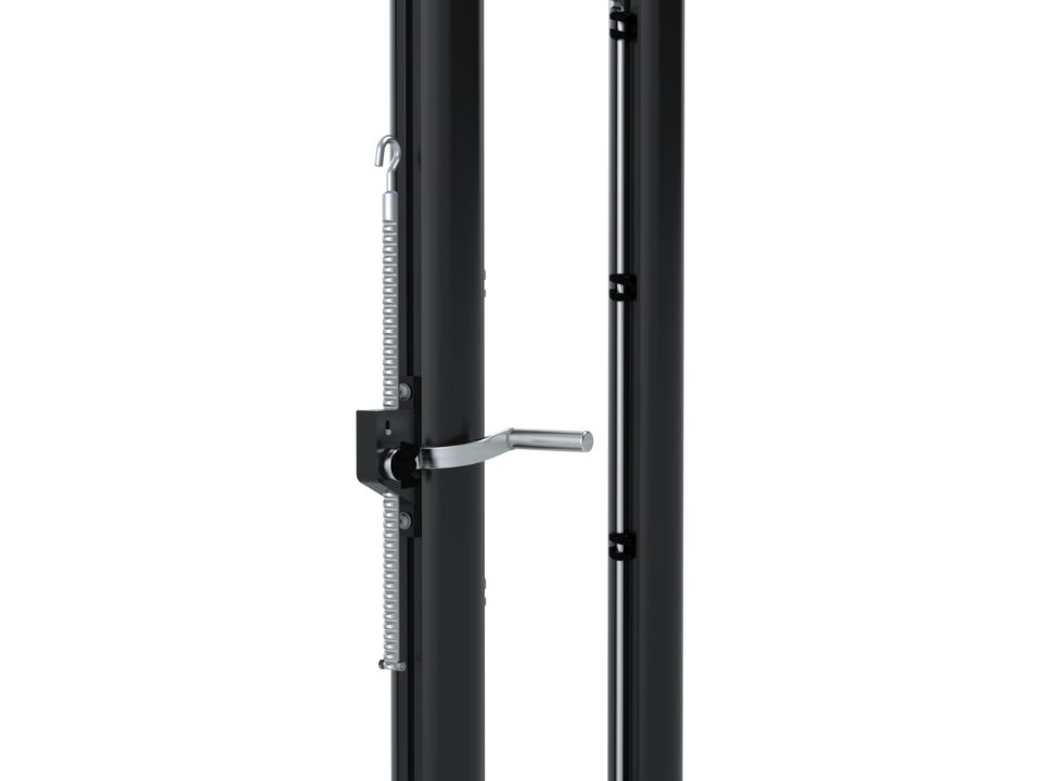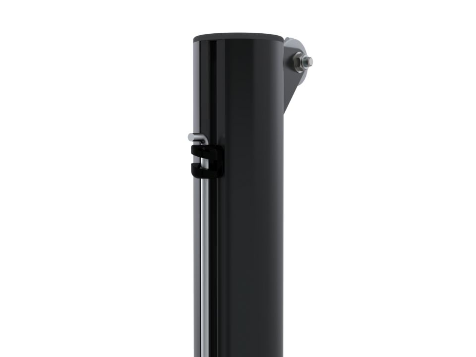 Socketed tennis posts in black powder coated aluminium with Ø90mm round cross-sections. External net tensioning winch, sold with crank handle.